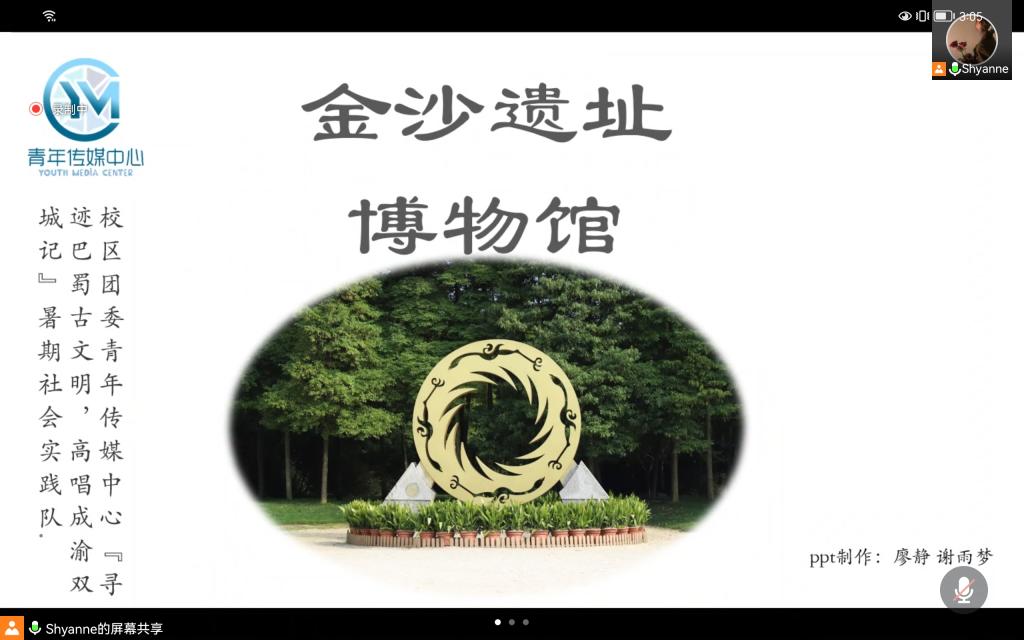 7月14日下午,校区团委青年传媒中心“寻迹巴蜀古文明,高唱成渝双城记”暑期社会实践队成员进行了一场金沙遗址博物馆“云参展”。此次会议分为介绍金沙遗址,文物古迹欣赏,实地拍摄vlog以及联合建设成渝双城经济圈的探讨。