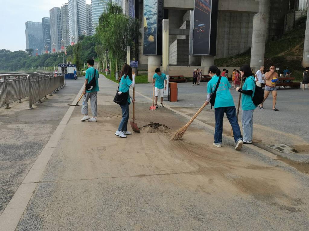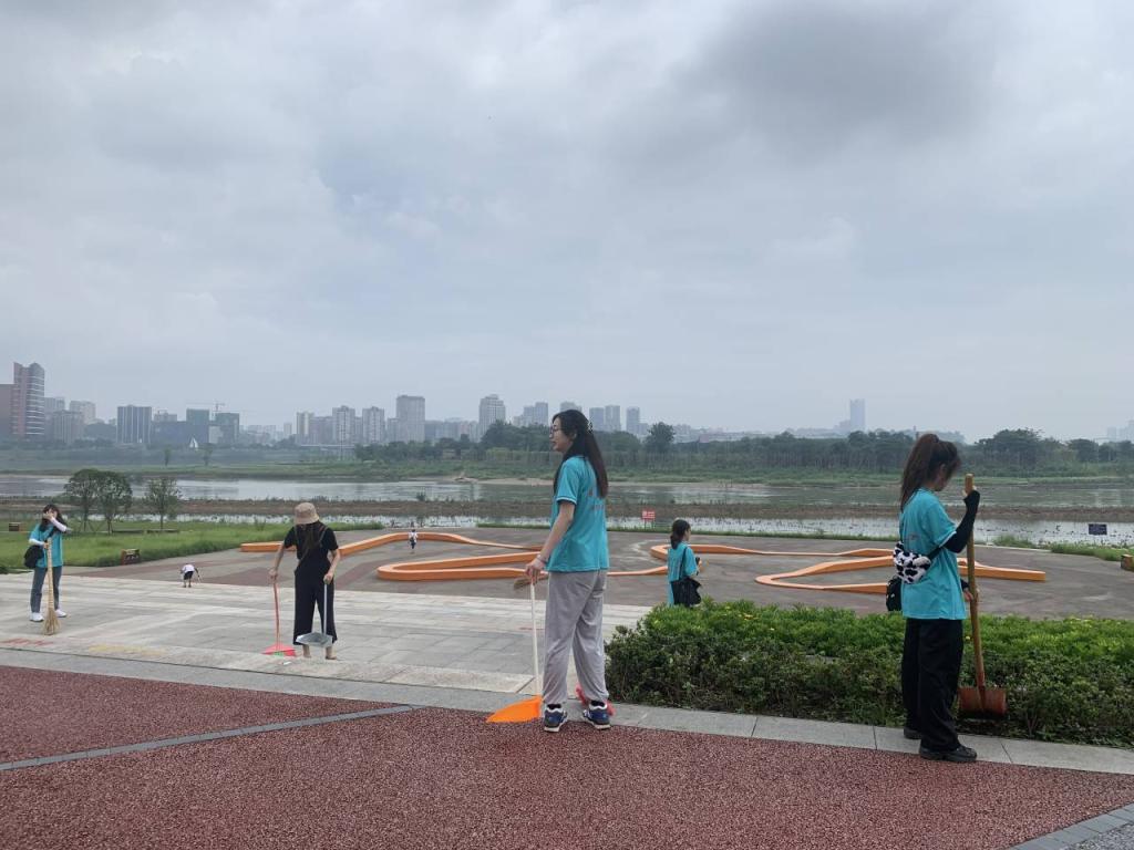 实践队员在印象嘉陵江湿地公园休息地打扫卫生
