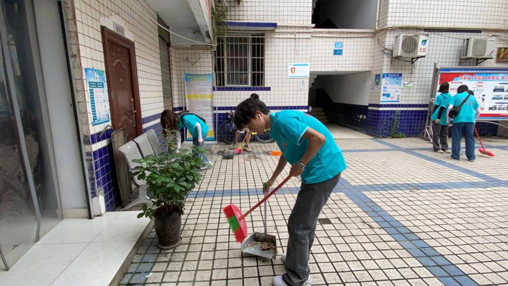 实践队员在舞凤街道石油路社区打扫卫生