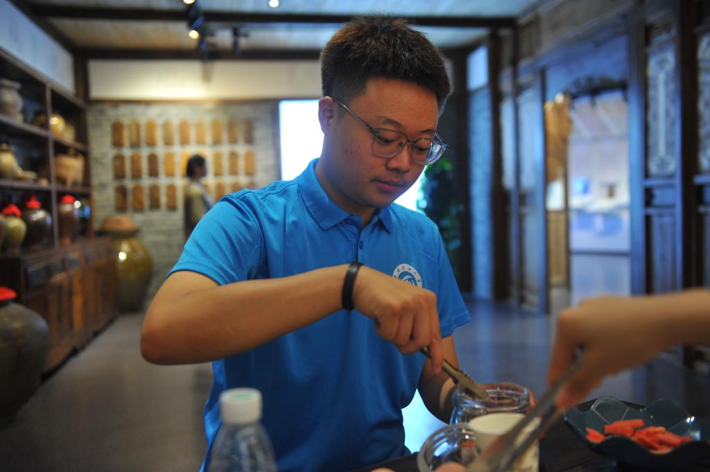 上午十点,公司负责人的带领同学们参观了老坛子食品有限公司以及老坛泡菜传统的技艺制作工厂,负责人介绍了腌制泡菜的传统工序、泡菜制作过程中的传统制作技艺、管理方式等。让队员们对眉山泡菜的制作有了更深刻的了解。接着队员们参观了四川省惠通食品有限公司,在负责人介绍下,了解了公司发展情况以及泡菜创新技术等。最后,队员们参观了泡菜博物馆,并在馆内亲自体验了泡菜的制作。队员们将洗净的胡萝卜、洋葱、生姜等原材料放入坛子中,再浇上老母水静置几小时,酸甜爽口的泡菜便制成了。同时在参观博物馆时,队员们了解了泡菜的历史及发展情况,对泡菜文化有了进一步认识,收获颇多。