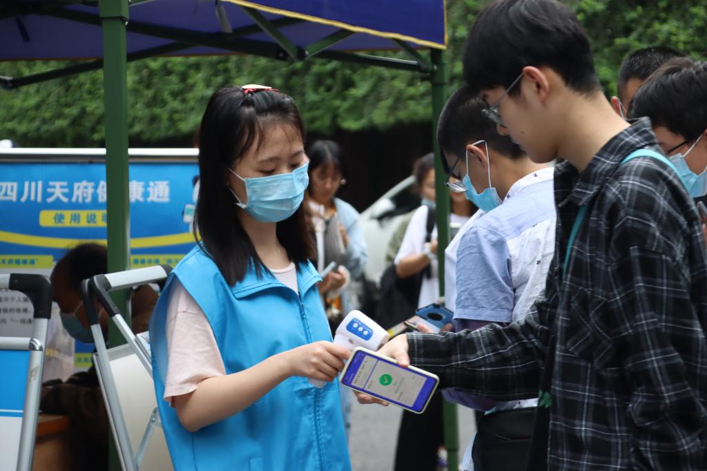 志愿者在校门口为新生测量体温