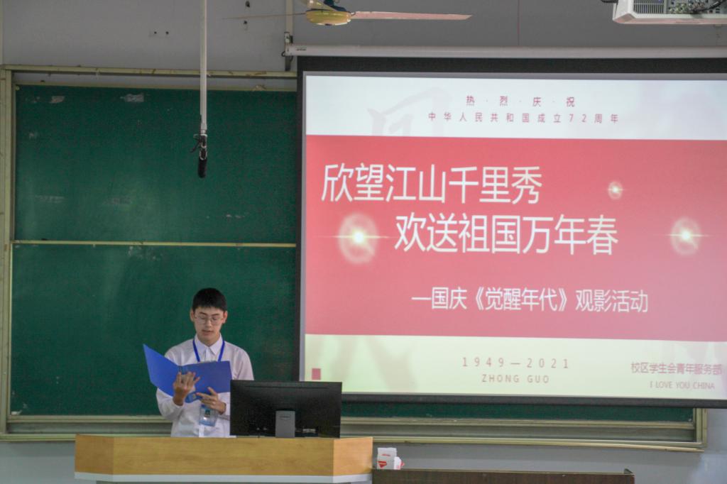 为加强党史学习教育,传承红色革命精神,激发同学们的爱国热情和国家认同感,引导同学们贯彻科学发展观,10月14日,校区学生会青年服务部于第四教学楼517教室开展“欣望江山千里秀,欢送祖国万年春”《觉醒年代》红色观影活动。