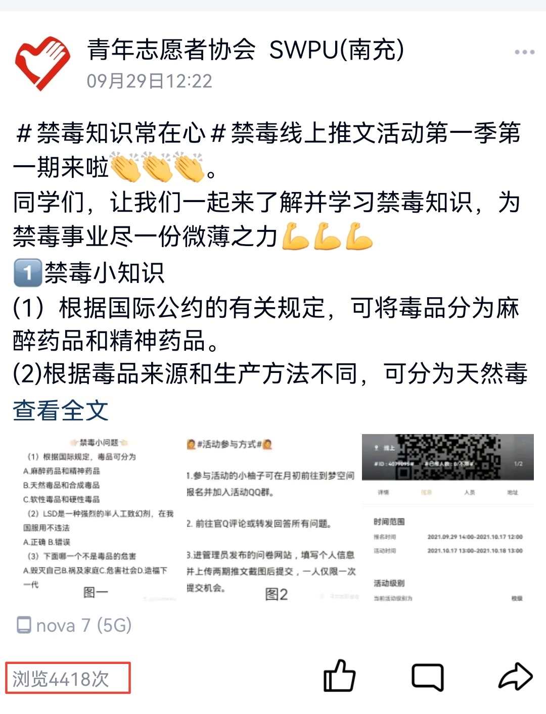为加强禁毒防毒知识在校园的宣传力度,加深同学对毒品危害性的认识,让更多人远离毒品、热爱生活,9月29日至10月17日校区青年志愿者协会于线上开展“宣传禁毒知识,争做先进青年”禁毒推文活动。