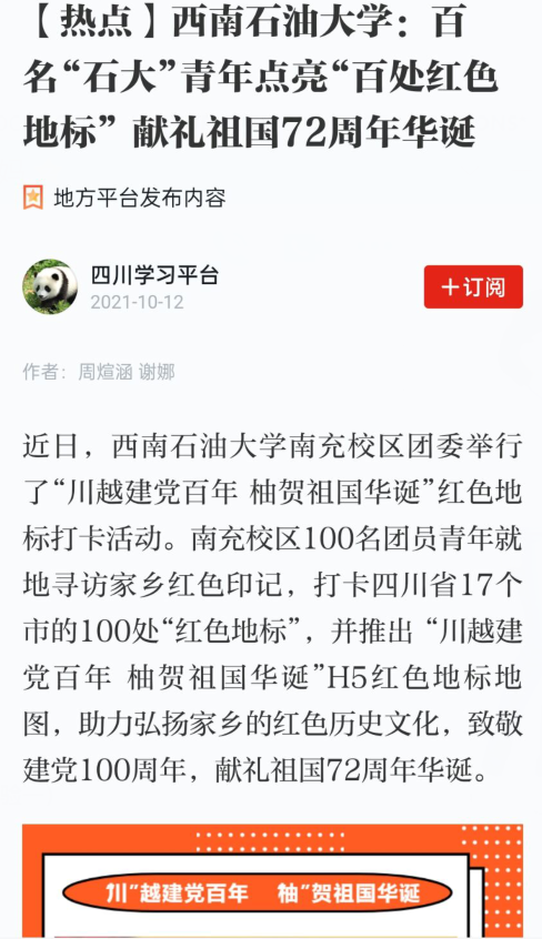 近日,四川新闻网,学习强国APP、新浪新闻、南充见APP、直播南充、西南石油大学微信公众号等多个媒体平台发布了校区团委“川越建党百年 柚贺祖国华诞”国庆红色地标打卡活动H5地图。截止目前该活动为止在各大平台的浏览量达一万四千余次。