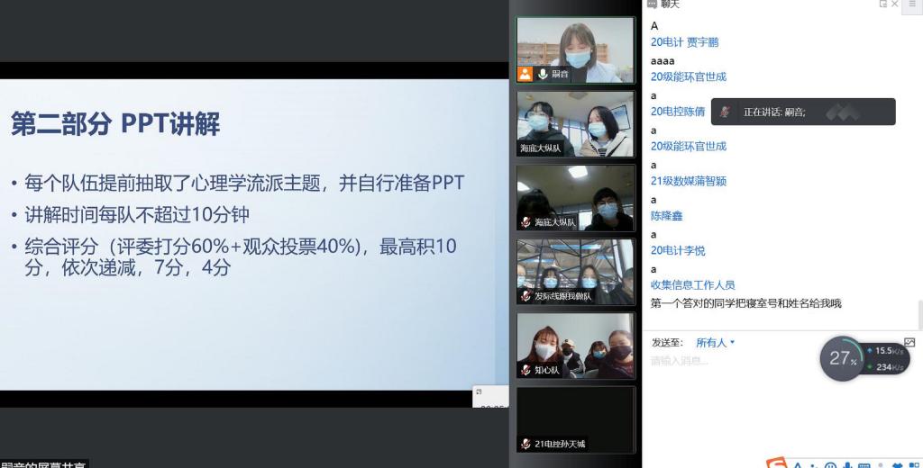 为了让同学们认识到心理健康的重要性,了解心理知识。11月21日下午2:30,校区阳光心理协会在腾讯会议上组织开展“三高校心理知识竞赛”活动。本次活动由西南石油大学、川北医学院和南充职业技术学院三所高校共同开展,线上活动人数达201人。