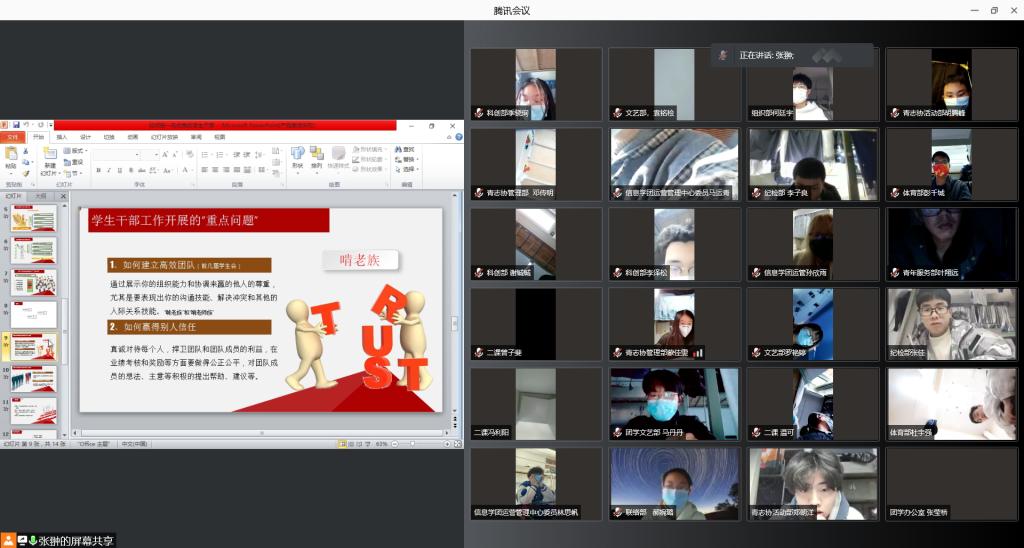 为进一步提高信息学院学生干部的综合素质,增强学生干部自我教育、自我管理、自我服务的意识和能力,11月24日中午1:00,信息学院在第二教学楼2206教室开展了“青蓝计划”学生干部培训之如何做一名优秀的学生干部。信息学院团总支副书记、学生工作办公室副主任胡丹主讲,学院全体学生干部通过线上和线下的方式同步参与。