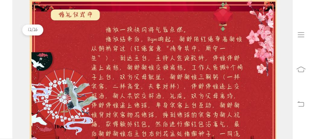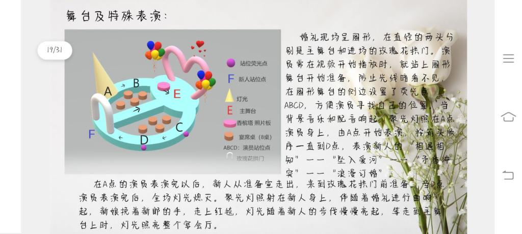 本次活动分为两个阶段。参赛人员先自行构想出对本次活动主题“婚礼策划”的想法,并将其书写为策划书的格式,后由协会对各参赛策划进行评选。入围选手则需制作出详细介绍该策划案的PPT演示文稿,以便参与后续线上答辩环节。各小组分别派出代表对本组演示文稿进行讲解,并在讲解完毕后进行答辩。协会评委及观众根据演示文稿的质量、内容及小组代表的答辩情况进行综合评分,最终选出前三名。本次活动为参赛同学提供了一个锻炼策划能力的平台,并使同学们对“情景模拟类活动策划”有了初步了解。