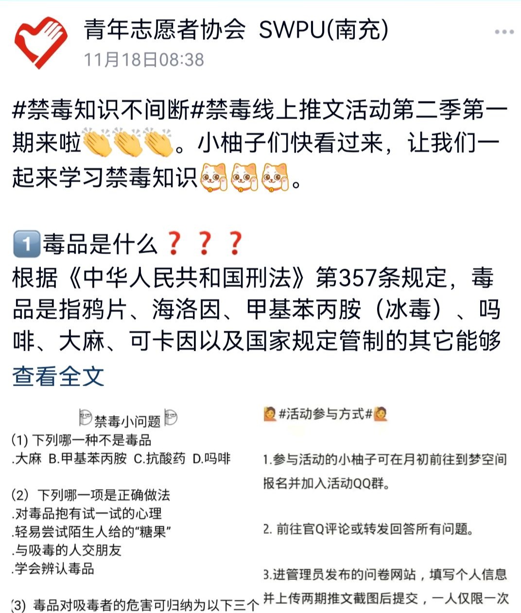为提高在校学子的禁毒意识,为同学们普及毒品预防知识,11月17日至11月30日,校区青年志愿者协会禁毒防艾志愿服务队开展了以“珍爱生命,远离毒品”为主题的禁毒线上推文活动。