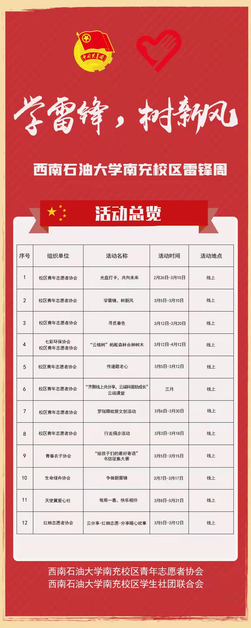 校区青年志愿者协会共推出以下活动,“学雷锋、树新风”雷锋精神分享活动、“光盘打卡、青春一起向未来”光盘打卡活动、“寻觅春色”绿植保护分享活动、“传承雷锋精神,爱老敬老同行”传递敬老心活动、“齐聚线上共分享、云端科普助成长”云端课堂活动、罗瑞卿故居文创活动、行走捐步活动。