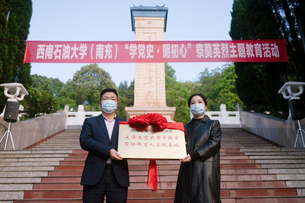 为更好推进党史学习教育常态化长效化,西南石油大学南充校区与南充市烈士陵园决定共建大学生党史学习教育暨协同育人实践基地,校区团委书记兼学生工作部副部长随明明与南充市烈士陵园服务中心主任唐洪义共同为实践基地揭牌,因圆满完成烈士安放遗骨,唐洪义为校区国旗护卫队授锦旗。他表示,基地将充分依托红色资源优势,让党史教育更生动,更鲜活。