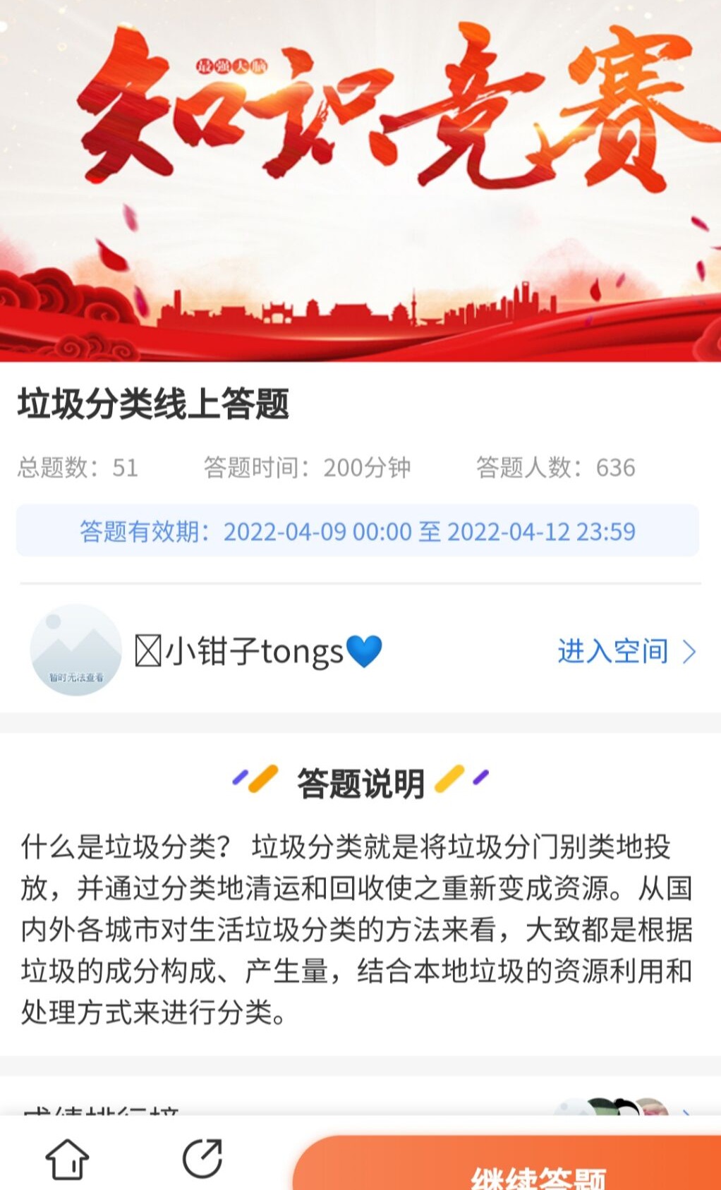 2022年4月9日到4月12日,七彩环保协会成功地举办了垃圾分类线上知识竞答活动。本次活动宣传了绿色环保的时代理念,让同学们更好地了解到垃圾分类政策的有关内容以及垃圾分类的一些基本知识,为同学们进行环保理念的交流提供了一个线上的平台。