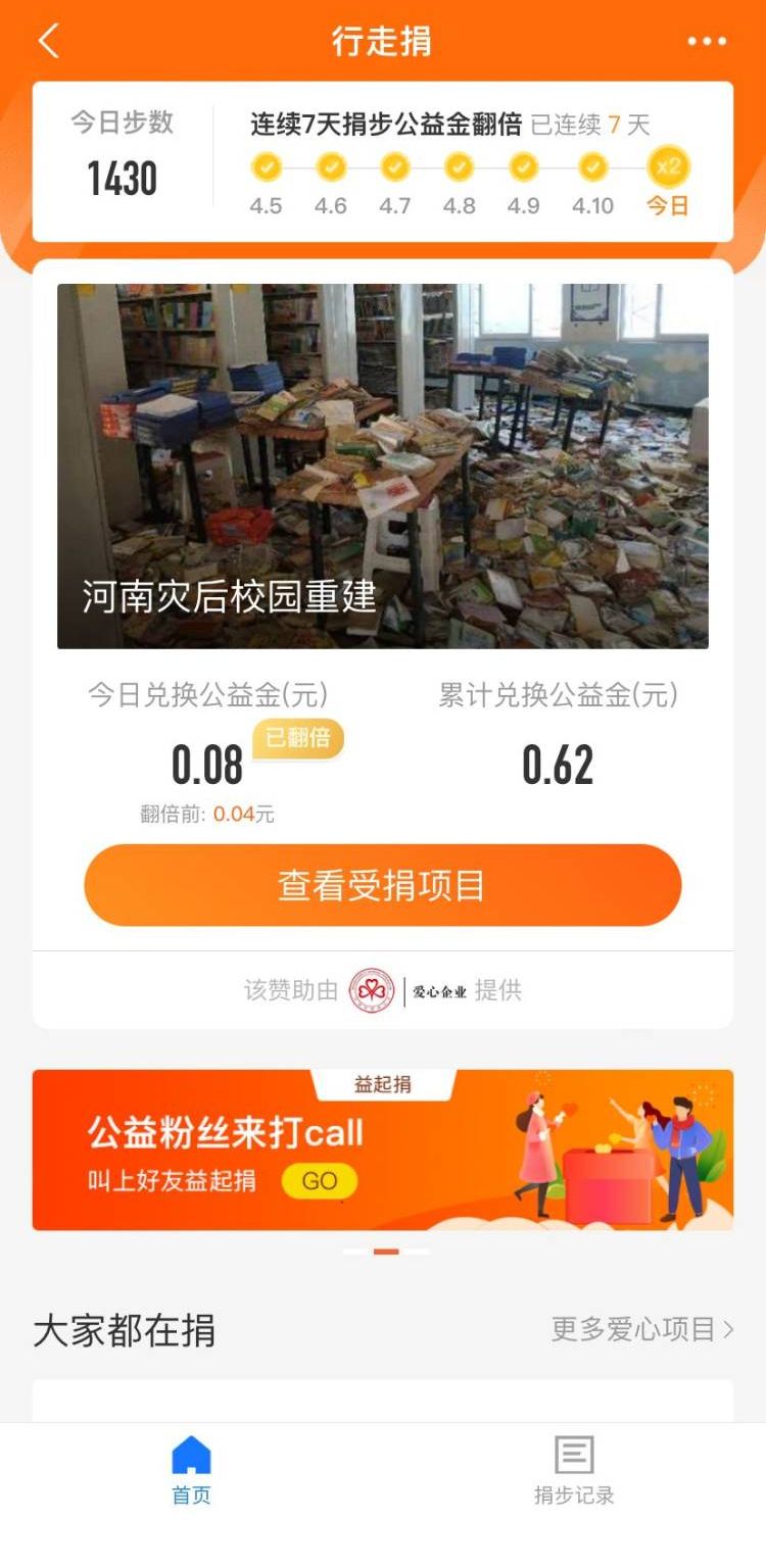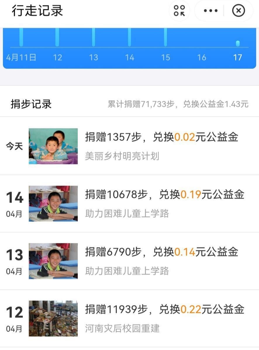 为学习雷锋精神,促进社会和谐发展,弘扬互帮互助的精神,增强在校学子的幸福感与使命感,4月4日至4月17日,校区青年志愿者协会项目部“益起来·艺起爱”志愿服务队再次开展了以“让行走彰显力量,用脚步丈量公益”为主题的支付宝捐步活动。