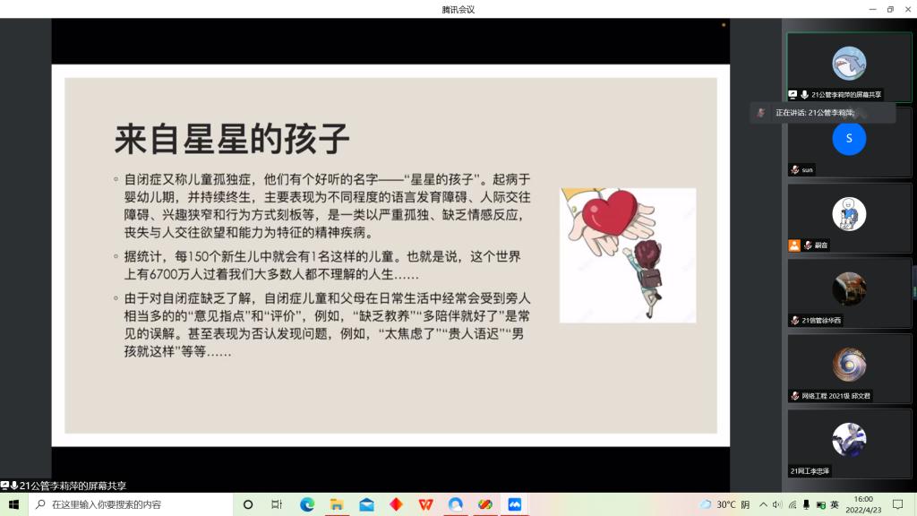 为了让广大的大学生们进一步了解心理知识,4月23日下午15:00,校区社团联阳光心理协会在腾讯会议上组织开展了“心理知识科普”活动。