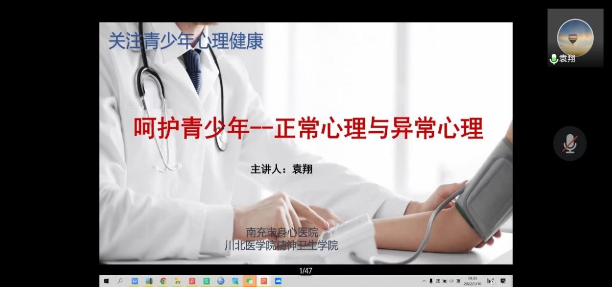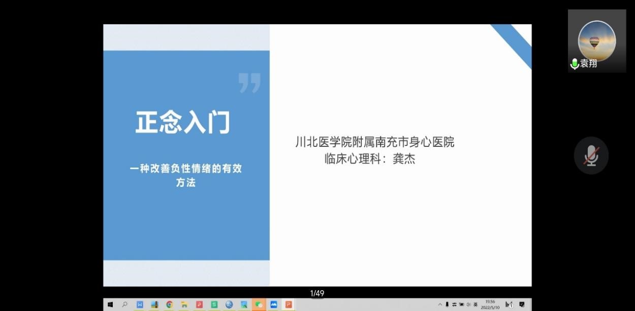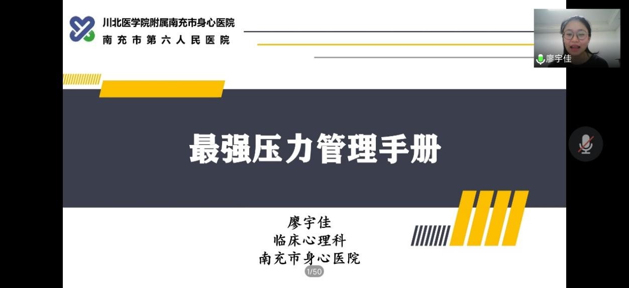 为进一步提升校区学生心理健康水平,5月10日晚,校区心理健康教育中心特邀川北医学院罗家明教授,川北医学院附属身心医院袁翔院长、龚杰主任、廖宇佳心理治疗师四位专家通过线上的形式开展了“与心灵相约,与健康同行”系列心理健康知识讲座。