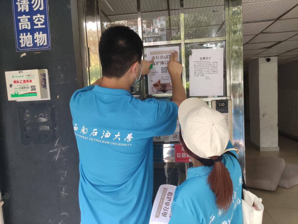 为呼吁社会关注流浪动物救助事业,推进建设人与动物和谐共处的生活环境,7月3日,西南石油大学“柚护萌踪”暑期社会实践队深入基层,走近居民,来到南充市顺庆区燕儿窝社区开展流浪动物救助事业宣传工作。
