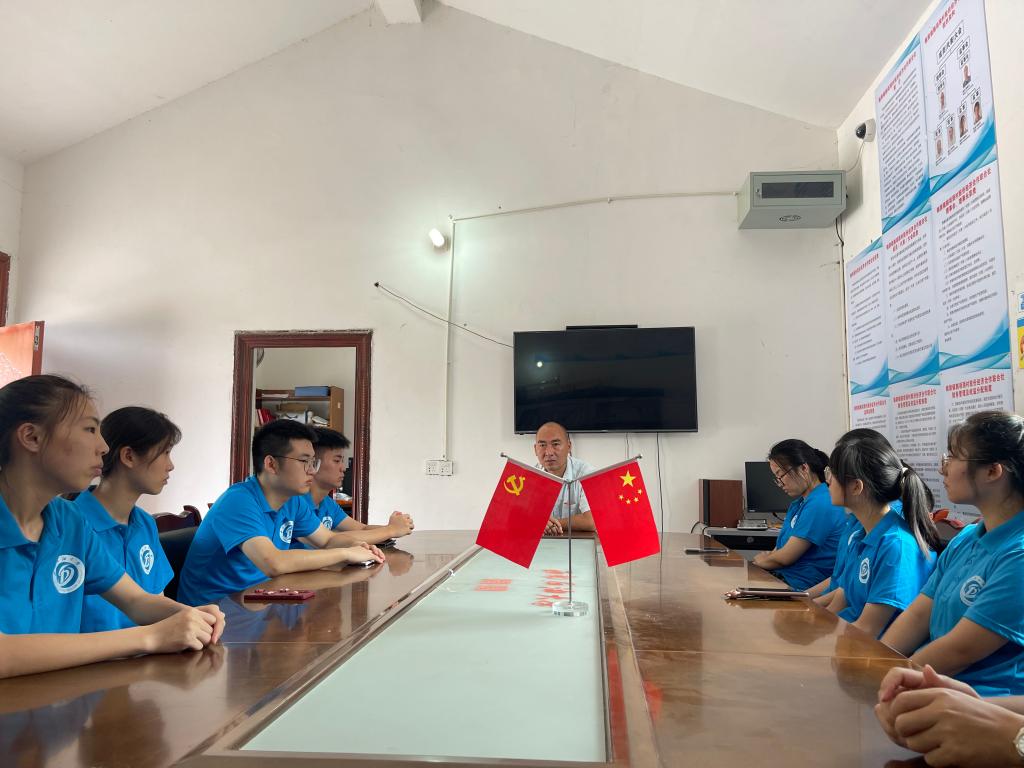 在此次实践交流会上,首先由实践队队长林斌斌提出了对本次活动的大致策划,重点希望以村校联合的方式助力乡村振兴,并向村支书征询活动意见。村支书高度肯定了实践队的活动策划,并表明愿意积极支持开展实践,配合活动安排。紧接着,村支书向我们讲解了鹅项颈村的大致情况。我们了解到鹅项颈村虽然早期在脱贫攻坚战中,取得了一定的成效,但是还有一定的问题存在,最主要的就是发展问题。鹅项颈村是山村,它依山而不傍水,这就造成了这里是严重缺水村,同时山村土地不成形的问题也加重了种植的困难,村内难以探寻较好的发展途径。唐书记还告诉我们,在社会各界人士的帮助,以及村民的团结努力下,鹅项颈村近几年来发展迅速,村民的生活已经得到较大程度的改善,并相信未来的日子会越来越好。