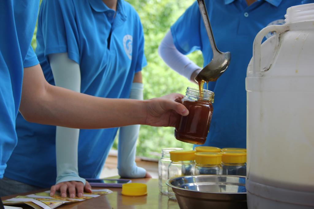 从蜂巢取蜜开始到蜂蜜装罐经历了采蜜、摇蜜、灌蜜三个过程。部分队员将蜂巢蜜取出后,将结晶蜂巢蜜交给专业养蜂人预热、过滤,冷却预热后的蜂蜜倒入塑料桶内冷却,这里的蜂巢蜜大多用玻璃瓶包装,团队成员先将玻璃瓶洗净,然后将蜂蜜倒入玻璃瓶,接着再贴上蜂场自制的不干胶标签,标签上印上蜂蜜的品种、浓度、生产日期、电话、蜂场地址等信息,最后拧紧盖子储存。