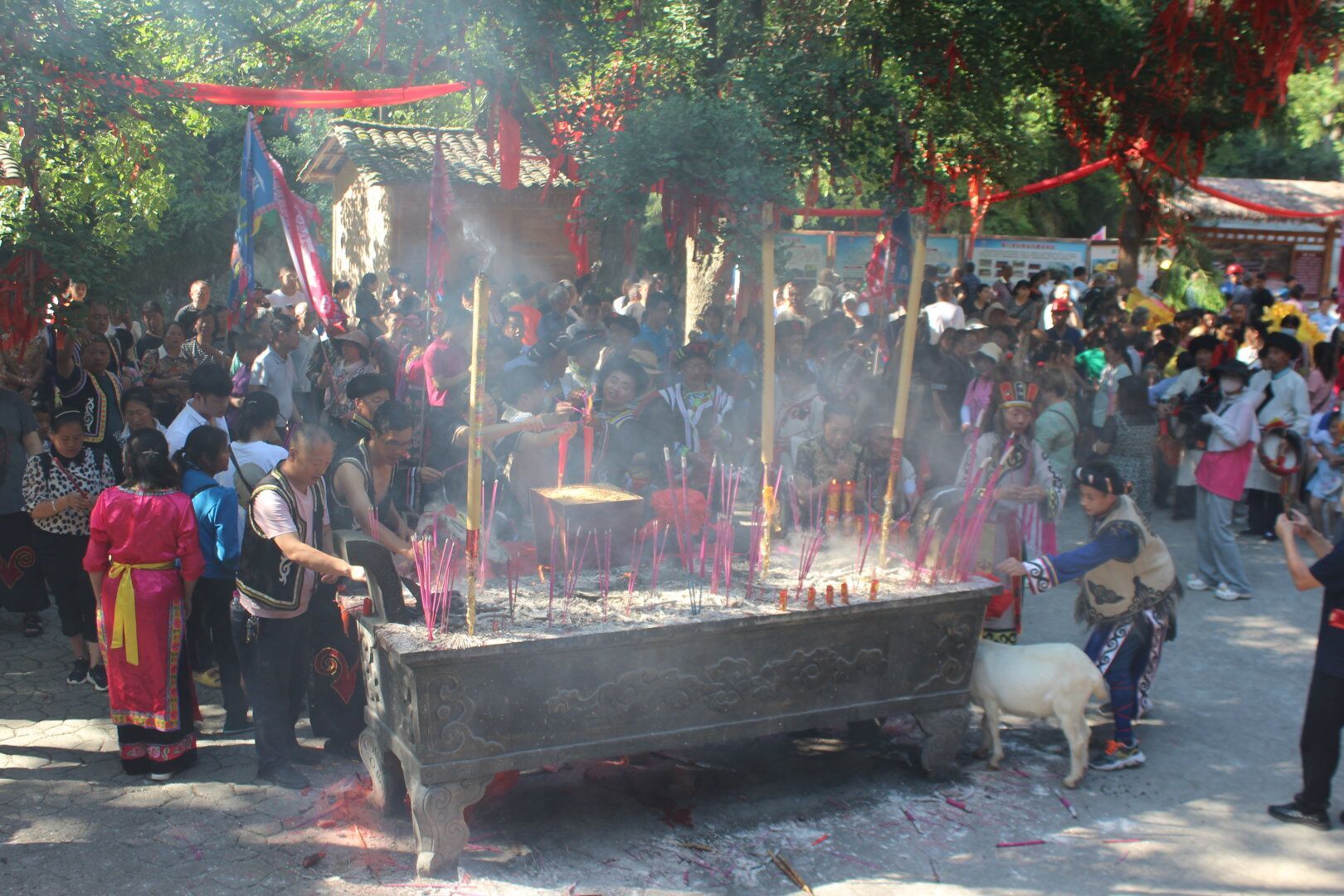 祭祀队伍由礼炮方阵,祭品方阵,羊皮鼓方阵,大祭司带领的大禹治水蓑衣方阵,舞龙方阵,羌旗方阵,羌红方阵组成。早上八点半整,祭祀典礼正式开始,部分实践队员们也加入祭祀方阵,手捧羌红,跟随着祭祀队伍,一路上乐声不断,羌族人民的脸上洋溢着幸福的笑容。行至大禹宫前,祭品方阵率先上前将牛头和猪头抬到供桌上,又将用于活祭的羊羔带到祭坛旁,羊皮鼓队围着祭坛跳着祈天舞,大祭司随后到大禹像前敬香,并高声唱和,愿来年风调雨顺、五谷丰登,而舞龙、羌旗、羌红方阵则排列在两旁,热情高涨的随声唱着。接着,方阵队伍边唱边跳,行至大禹祭台,由大祭司带领羌族人民祭拜大禹。