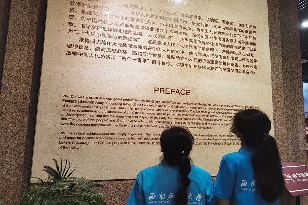 活动开始,实践队来到朱德纪念馆的大门。面对巍然高大的朱德总理的白石像,大家列队肃立,鞠躬致敬,表达对伟人的无限敬仰和缅怀。随后,队员们参观了朱德同志故居纪念馆,通过展出的文献资料、珍贵照片、历史实物等,瞻仰朱德同志从人民军队的缔造者到红军总司令的伟大历程。除此之外,队员们还参观了朱德同志诞生地、朱德同志旧居、国防教育园等展览基地,通过实地学习,感悟伟人精神,传承革命风尚。
