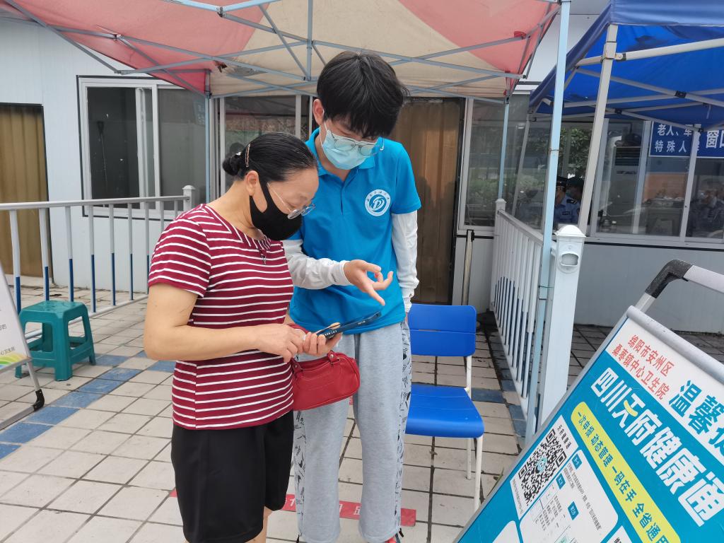 活动过程中各个防疫服务点各司其职,尽心服务。第一个志愿服务点,两名队员在医院门口督促进入医院的人们戴好口罩,同时检查并指导来往人员扫描场所码;第二处服务点,两名队员的主要工作是帮助值班的医护人员维持秩序,并测量体温,填写预检表实现人员分流减少人员拥堵,进行预检分诊;第三服务点由两名队员检查健康码行程卡的同时设立“爱心导医”服务台指导带领就诊患者准确迅速的找到对应科室;第四处服务点于住院部陪护人员检查点,检查进出人员是否符合医院规定,避免闲杂无关人员进入住院部造成不必要麻烦。第五处服务点主要负责协助医护人员制作中药贴、帮助护士给瘫痪患者换药以及带领人员到疫苗点处接种疫苗。