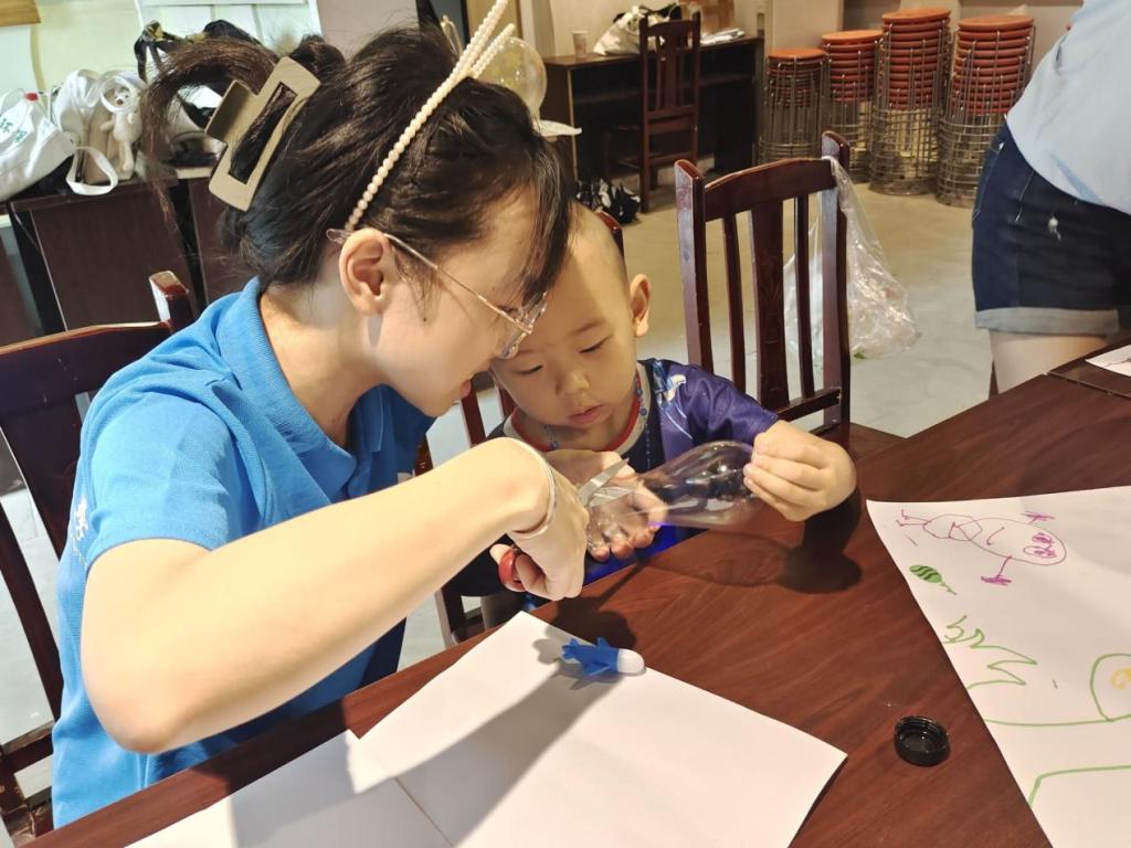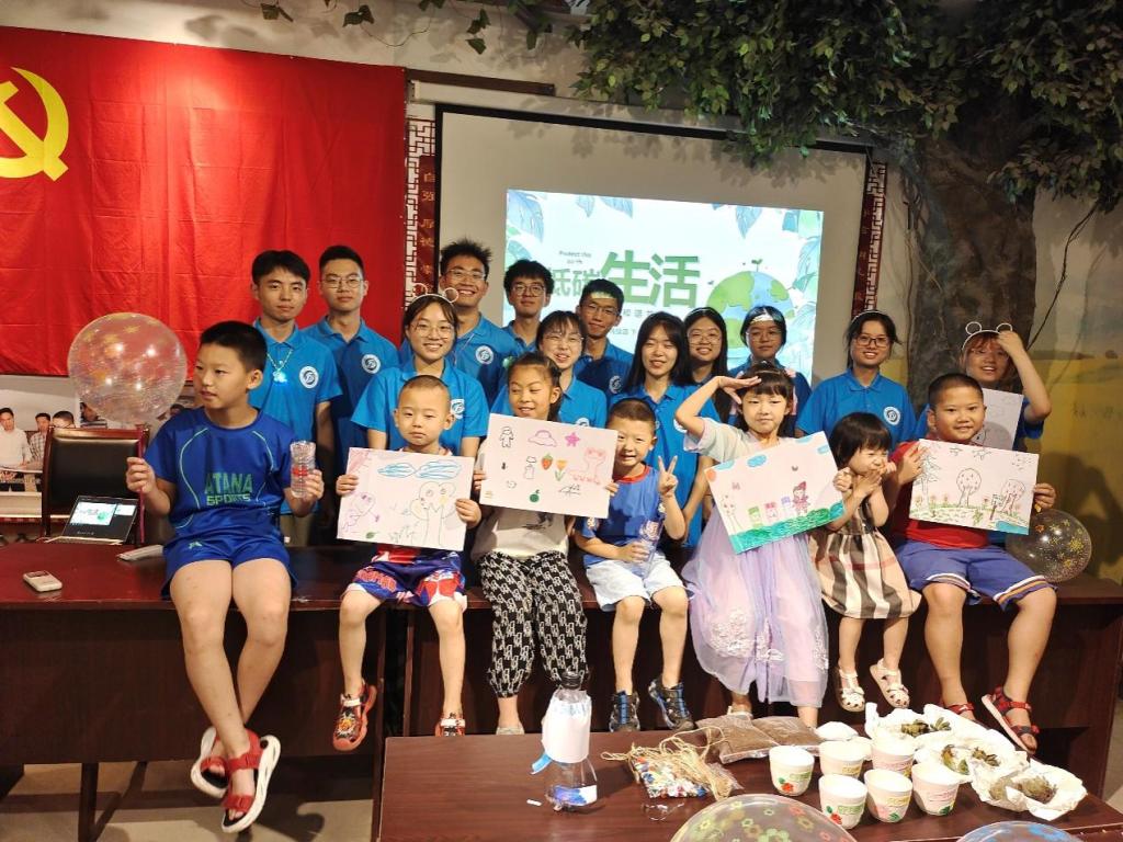 活动第二天,实践队为小朋友们提供了画笔和纸,让小朋友们把他们心中的低碳环保画在了纸上,同时也加深了小朋友们对低碳环保知识的印象。作画之后,队员们利用废弃的塑料瓶和纸杯,教小朋友做了好看的手工作品,让小朋友明白了变废为宝的道理。同时,也让小朋友学着种植盆栽绿植,在体验种植乐趣的同时也明白了多多种植绿植也能减少碳的排放量。