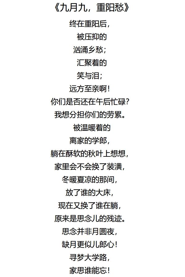 为帮助校区学子更加深入地了解重阳节的文化习俗,提高大家对诗词与文学的热情,弘扬中华传统文化。10月1日-10月7日,校区社团联青春飞文学社举办了“九九重阳”诗歌征集活动。