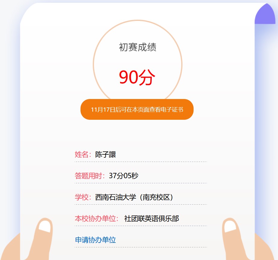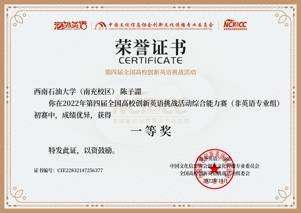 本次“全国高校英语创新挑战赛”由《海外英语》杂志社主办,校区社团联英语俱乐部协助,于我校举办。此次比赛全程在线上进行,面向南充校区全体同学开展,参赛项目重点为综合赛,全面考察同学们的英语综合素质能力。据统计,此次比赛,共有2021级和2022级100名同学参与其中。经过一个月的比赛之后,共有20名同学以优异的成绩进入了此次比赛的决赛。其中2021级工程造价陈子譞,2022级能源与环境系统工程周银桥等同学获得了此次初赛的一等奖。
