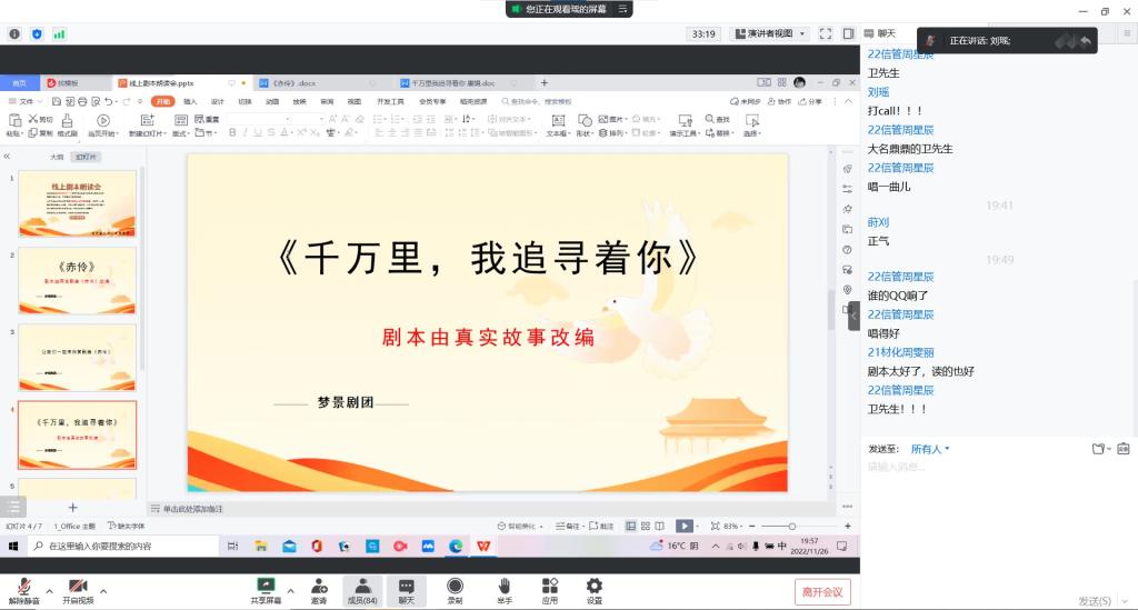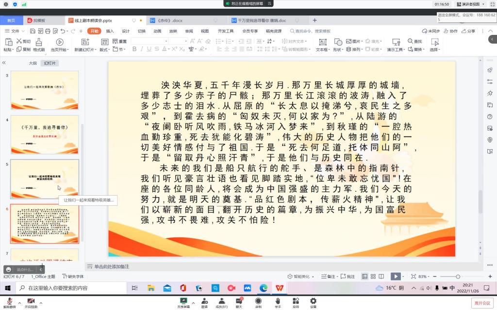 为增强同学们的文化自信,提高同学们的综合素质。校区社团联梦景剧团于11月26日19:30-21:30成功举办了“线上红色剧本朗读会”活动。