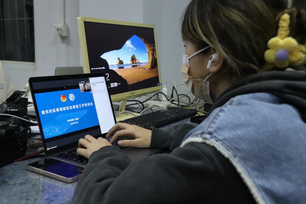 为切实做好学校疫情防控志愿服务工作,确保校区在疫情突发时能够及时、快速、安全、有序地开展疫情应急处置工作。11月28日晚,校区学生发展部(团委)通过腾讯会议开展疫情防控学生志愿者工作培训会,会议由校区学生发展部(团委)随明明老师主持,学生发展部(团委)副部长唐珊及相关负责老师、校区学生志愿者参与会议。