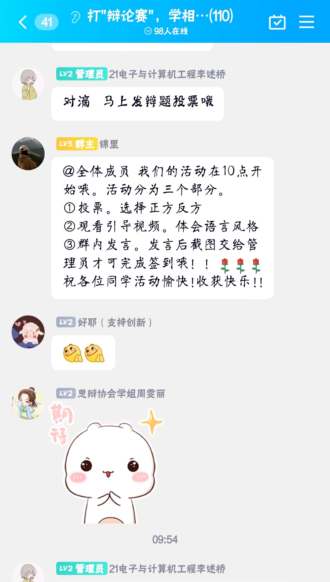 活动前期,两方协会理事通过海报、官Q推文、课间宣传、会员群等多种形式对活动进行宣传,积极扩大此次活动的参与度。活动过程中,活动理事提醒报名者参与活动,常务理事负责管理秩序。活动共分为三部分,活动第一部分,大家通过选票来选定正反方;之后同学们通过观看视频来体会语言风格,最后同学们在群内发言,发表自己的看法。活动过程中,同学们积极发言,踊跃发表自己的观点,其中吴鑫怡、王瑞、吴茜娅等同学语言用词犀利,角度清奇,获得同学们的一致认可,充分体现出当代大学生的艺术修养和创新思维。