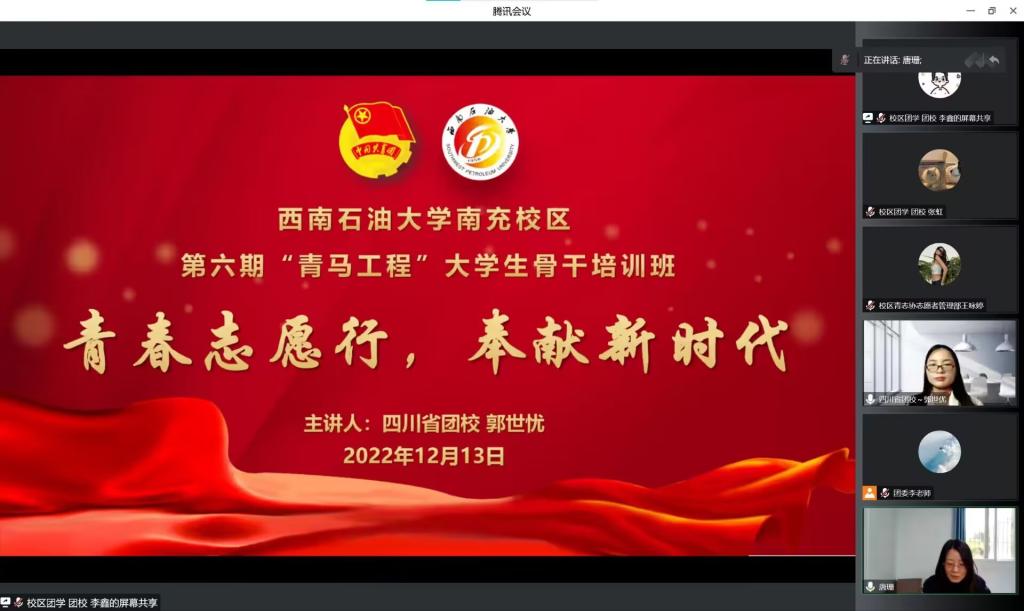为深入推进新时代青马人才建设,弘扬贯彻党的二十大精神,12月13日下午,校区第六期“青马工程”第三次理论培训在腾讯会议召开。本次培训由校区学生发展部(团委)副部长唐珊老师主持,四川省团校郭世优老师出席本次培训并为全体青马学员宣讲授课。
