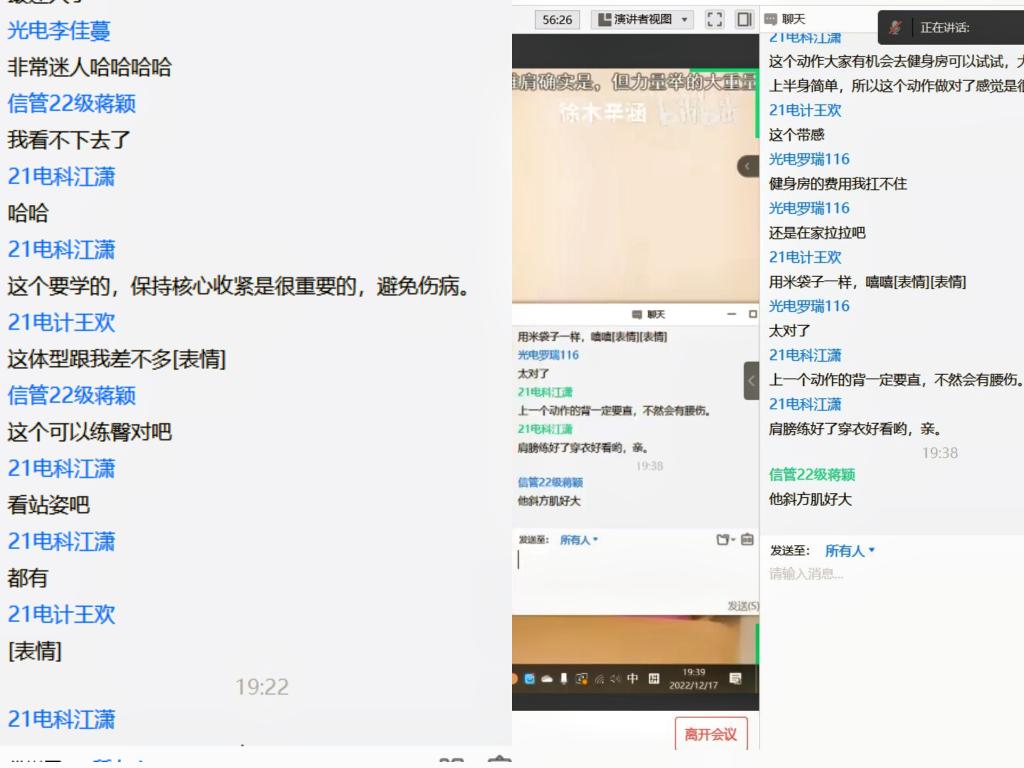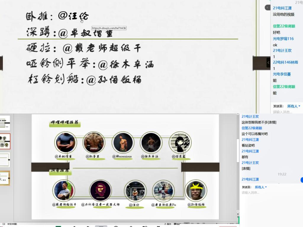 为提高同学们健身动作的规范性、协调性,感受健身的魅力,塑造强健体魄,树立长远的健身目标。12月17日19:00--20:00,校区社团联健身协会成功举办“学健身动作,拥优秀体魄”线上活动,共计50人参与。