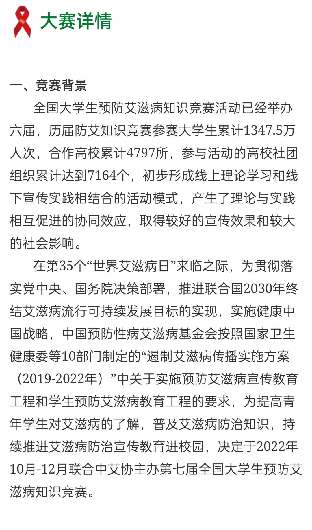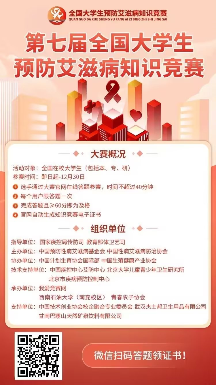 为了进一步加强学生对艾滋病的正确认识,增强广大学生的防艾意识,中国预防性病艾滋病基金会于10月-12月主办第七届全国大学生预防艾滋病知识竞赛。为响应该竞赛,校区社团联青春农子协会于线上成功举办了“第七届全国大学生防艾滋知识竞赛”活动。