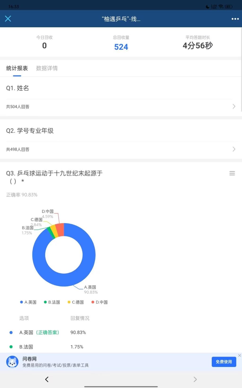 为培养乒乓球爱好者之间的良好氛围,增强同学们的交流联系。校区社团联乒乓球协会于12月18日-12月23日成功举办了“‘柚遇乒乓’线上答题”知识竞赛活动。本次活动共计246名小柚子参加。
