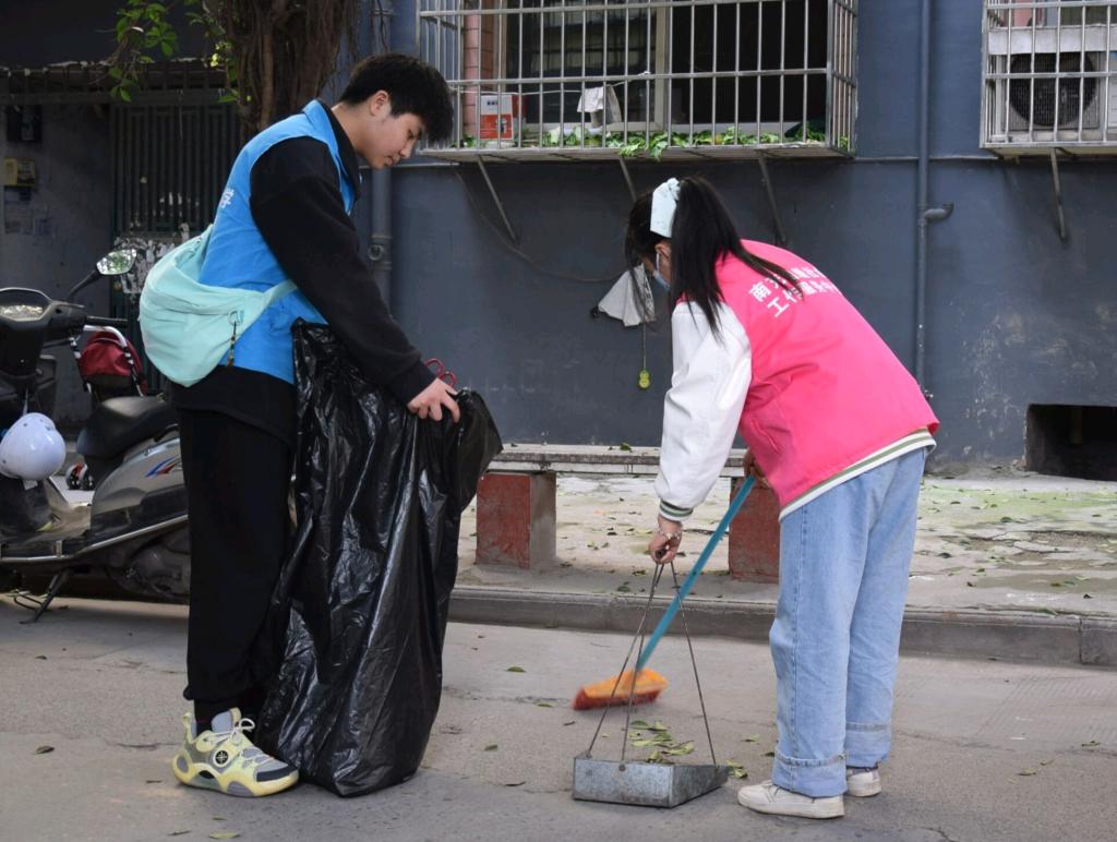 志愿者在社区内清扫垃圾