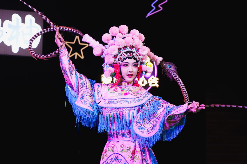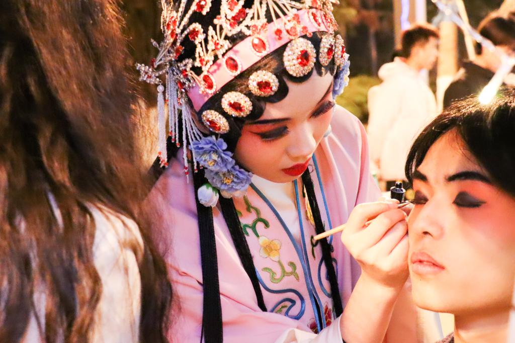 融服装、道具、表演互动于一体的非遗川剧文化沉浸式体验是本次社团文化月的一大亮点。19时,川剧《白蛇传》片段《新人间好》准时上演,吸引了众多学子围观、喝彩。19时30分《扈家庄》开演,现场演出高潮迭起、精彩纷呈、掌声不断。现场还设置三个展位,学生们可以自由体验川剧服装、道具和妆面。