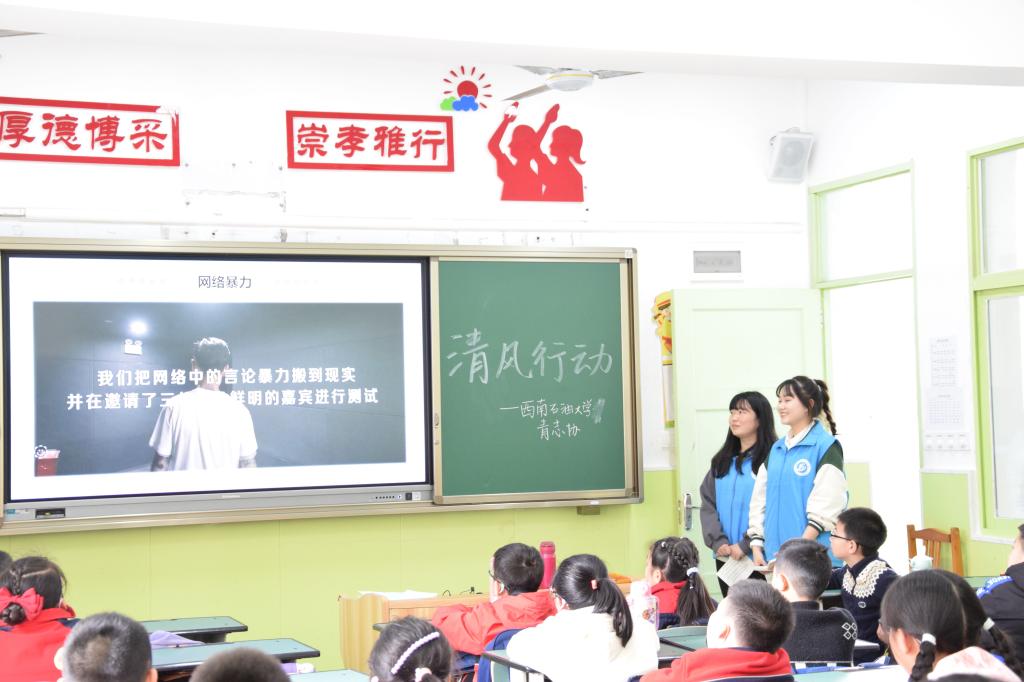 为了让同学们学会如何正确科学地使用网络,拒绝网络语言暴力,3月17日下午,校区青年志愿者协会开展了以“清风涤网络,文明树新风”为主题的爱心支教活动。