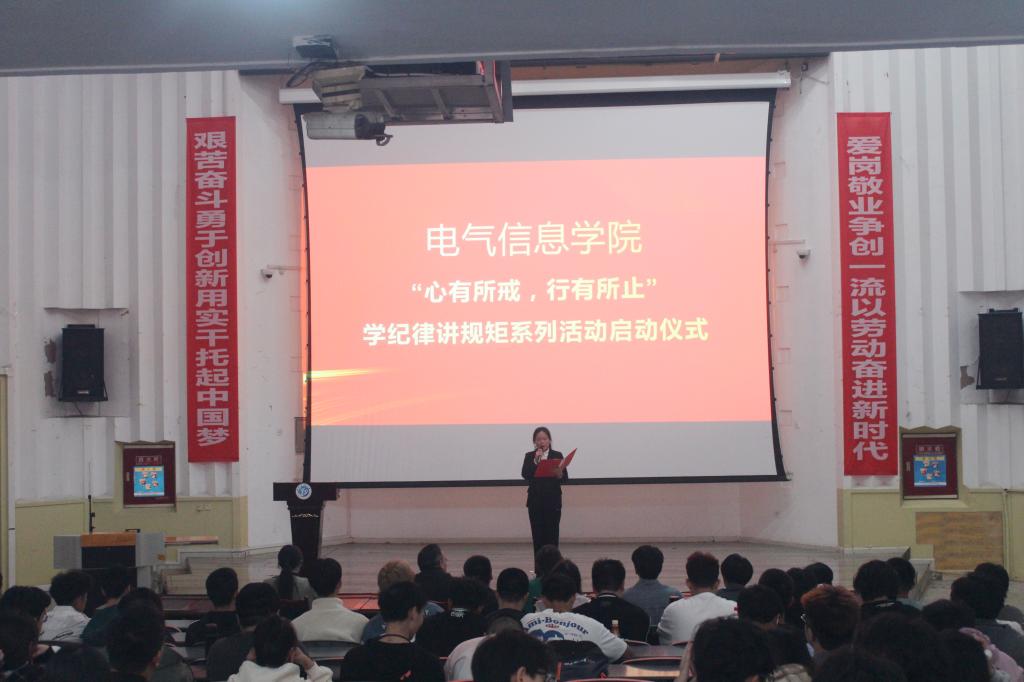 为教育引导学生牢固树立底线意识、严守纪律规则,共同营造学院良好的学风,4月25日,电气信息学院在多功能学术报告厅举行“心有所戒·行有所止”学纪律讲规矩系列活动启动仪式。电气信息学院副院长谌海云出席启动仪式并讲话。学院学生工作办公室(团总支)副主任刘新晖,辅导员易欣和300余名学生代表参加启动仪式。
