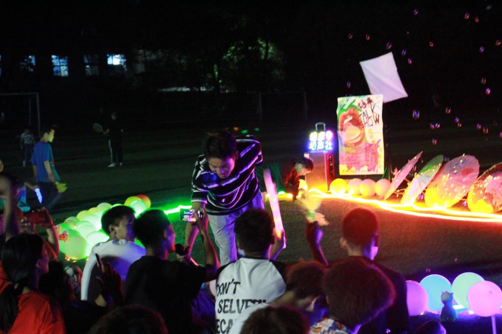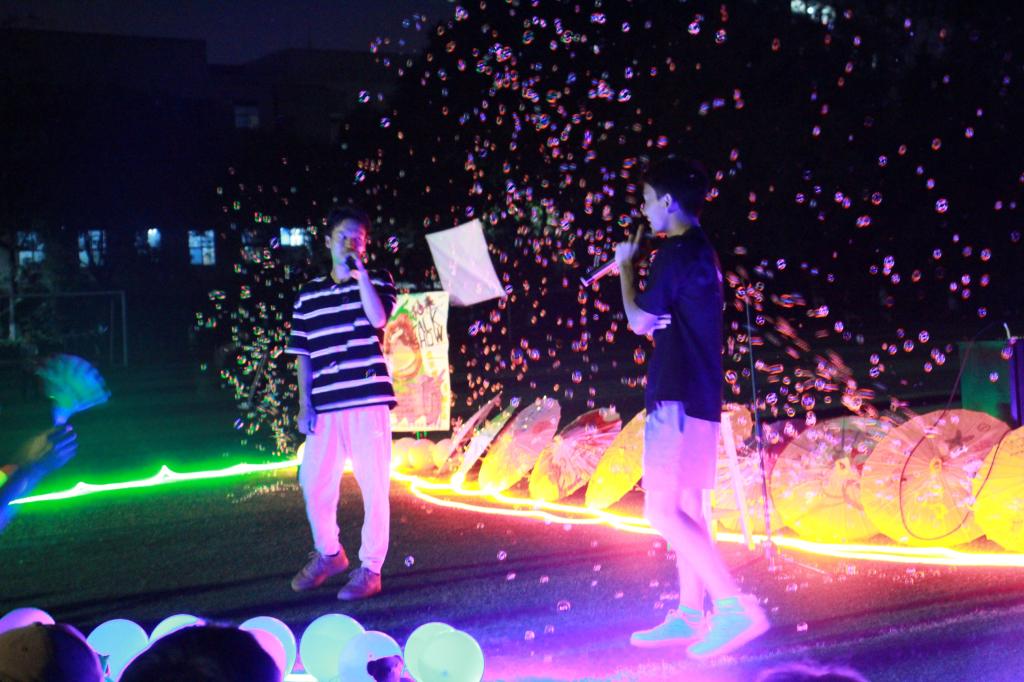 伴随着夜幕的降临,此次活动正式开始。一首《东京不太热》瞬间调动在场所有人员的气氛,同学们挥舞着手中的荧光棒,随着表演人员一起低声浅唱,沉浸在精彩的表演和美好的氛围中。为增强此次活动的趣味性和观赏性,充分推进活动进程,糖逗相声社成员结合时下热点问题,为同学们带来了《梦中情老板》《欲罢不能》《我爱我家》等脱口秀节目。