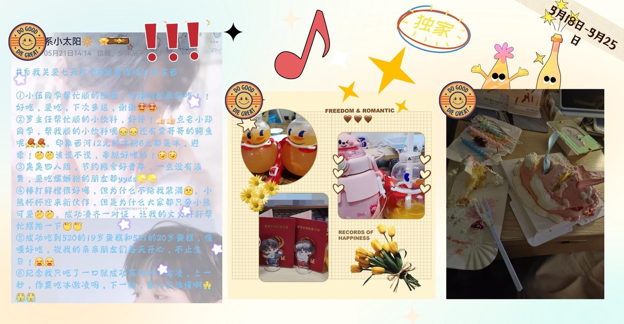 为进一步加强我校大学生心理健康教育,引导大学生关注自身的心理健康,学会在平时学习生活中进行自我关爱,创造校区学生健康成长的良好氛围。5月18日至28日,由心理服务中心主办电气信息学院承办的“人生食堂,五味皆尝”七天自我关爱打卡活动面向校区全体学生顺利开展。