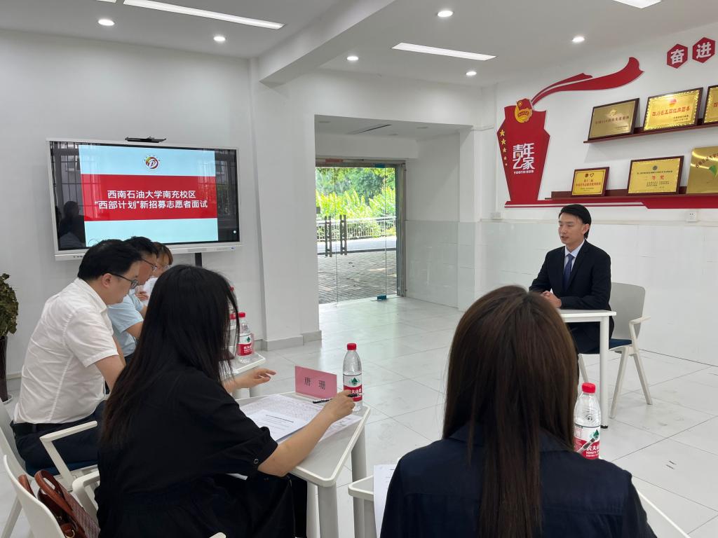 为进一步考察候选人的报考意愿及服务志向,在青年之家,共青团南充市委员会四级调研员马千里,校区学生发展部(团委)副部长秦明旺、唐珊,心理发展与服务中心吴静,团学工作中心王治平,对通过笔试的学生开展面试工作。面试主要考察个人志愿服务初衷、职业发展规划以及对西部计划认知等方面的内容,对学生进行综合评定。