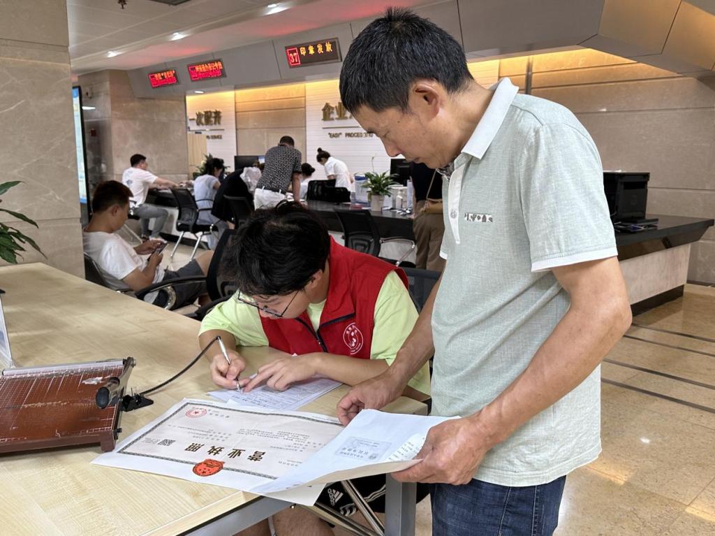 图为实践队员为办事群众填写资料