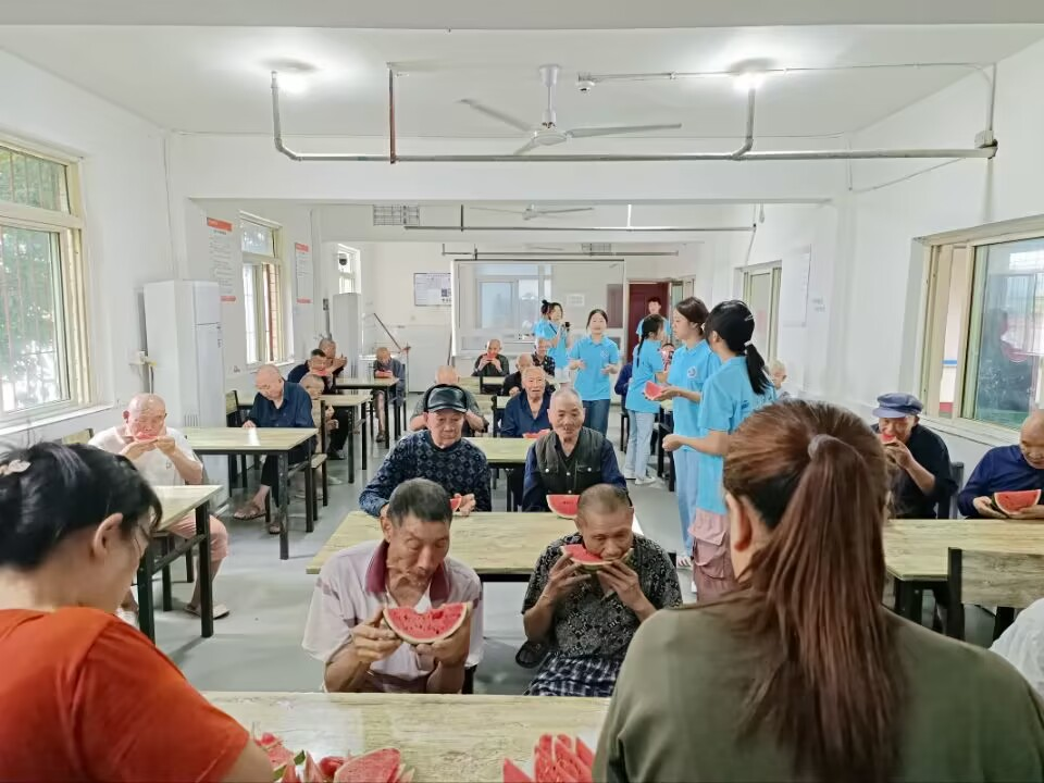 图为志愿者在给老人们分发水果