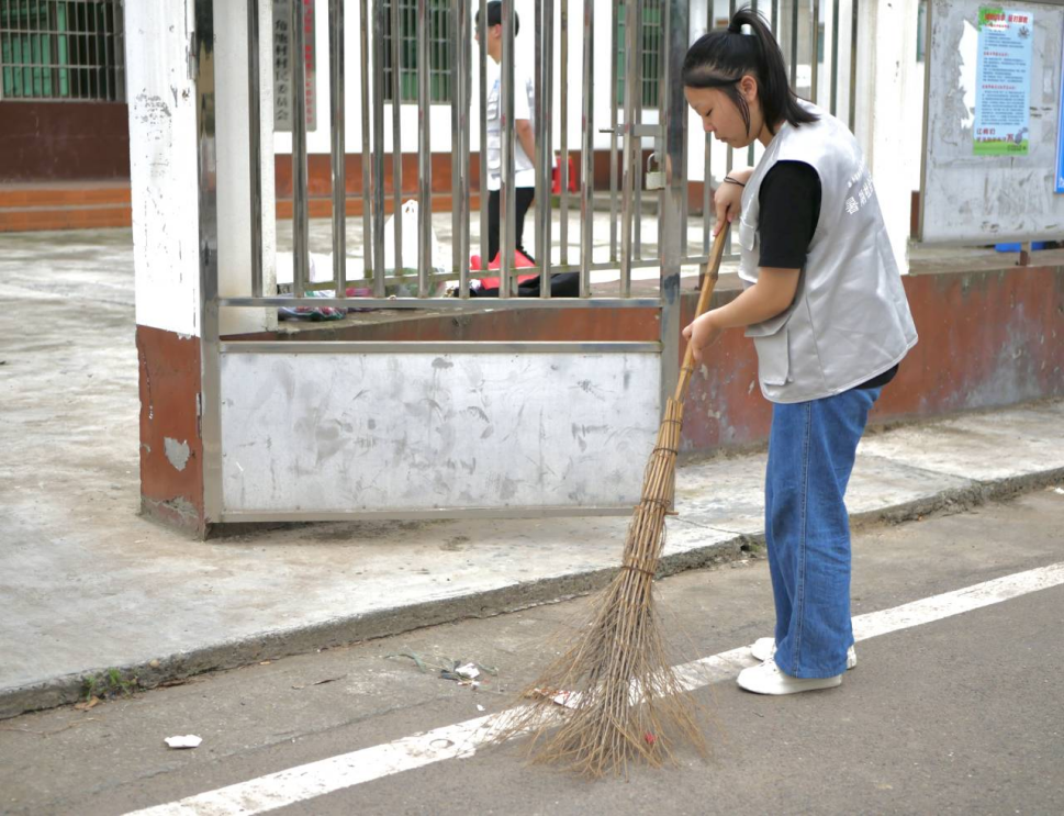 图为帮助村委会打扫街道