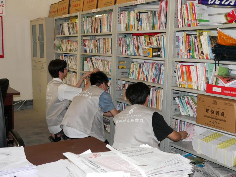 图为帮助村委会工作人员整理乡村图书角