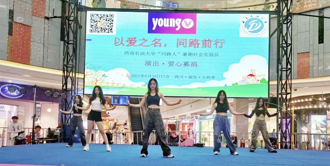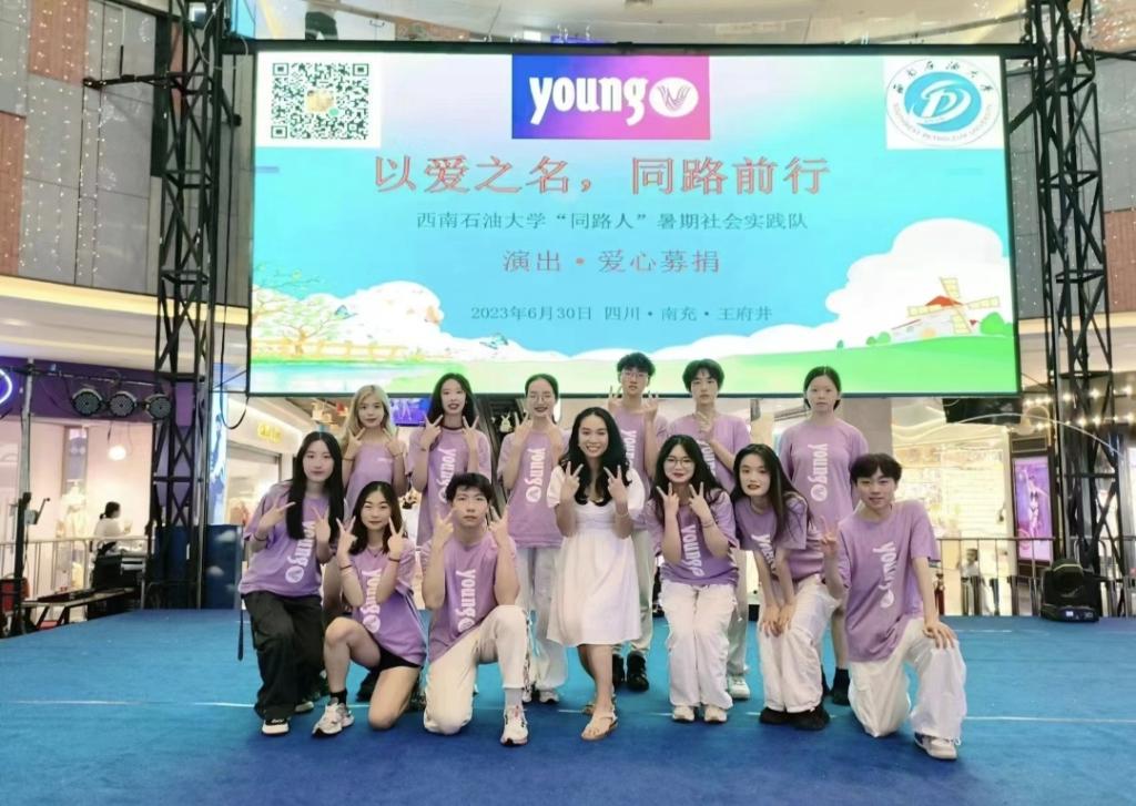 “Young-V同路人”三下乡实践队队员在赴南充王府井购物中心负一楼开展募捐义演 为广元市社会福利院的小朋友们进行募捐。