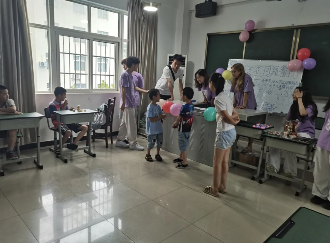 图为小朋友与实践队队员进行互动