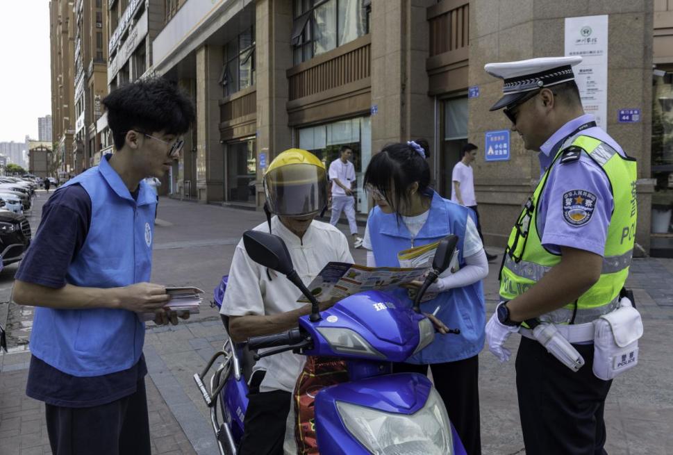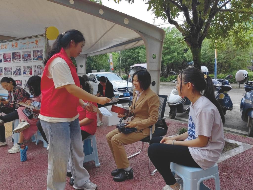 图为宣讲队员向家长学生普及宣传