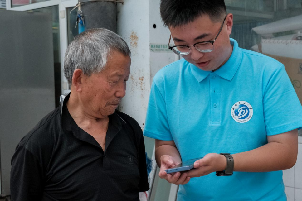 图为教授老人使用智能手机