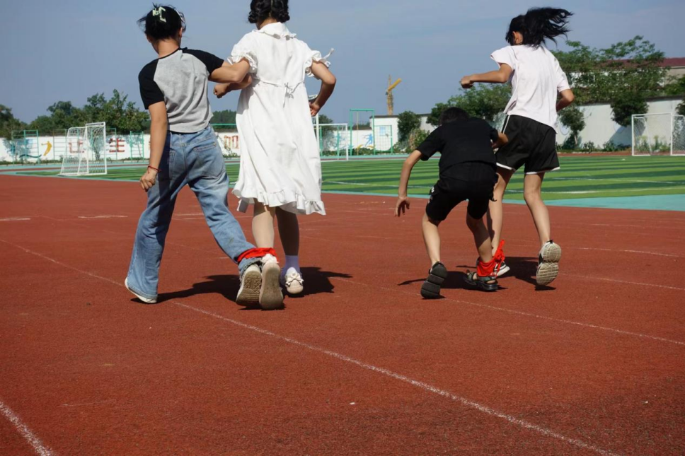 图为学生完成两人三足运动